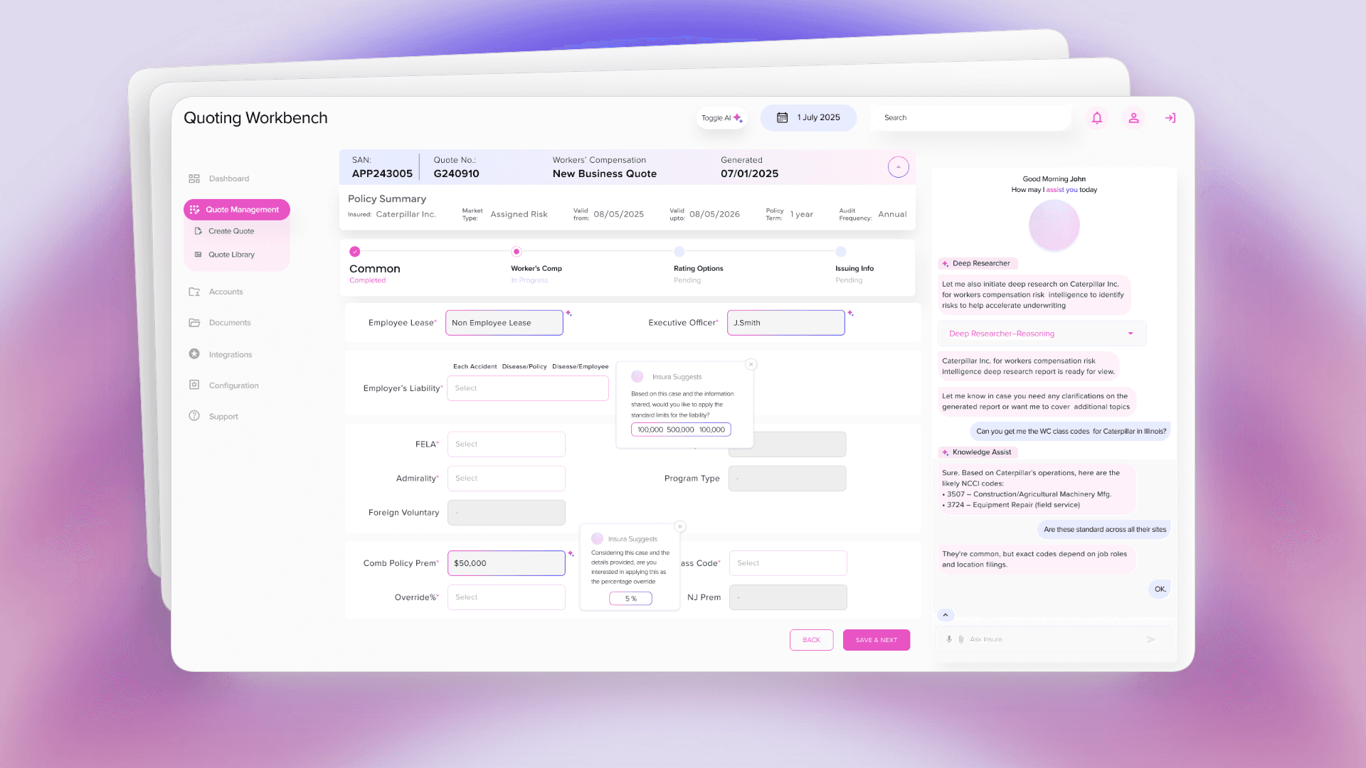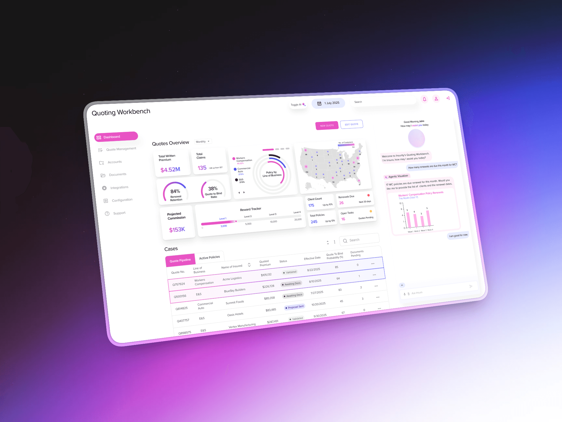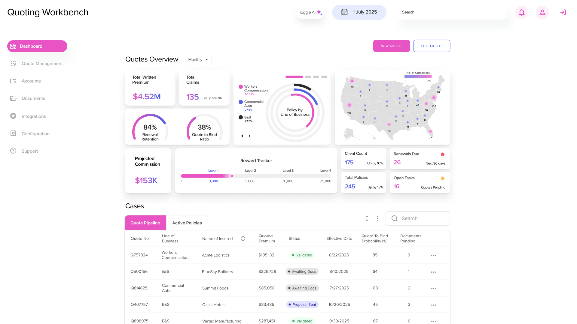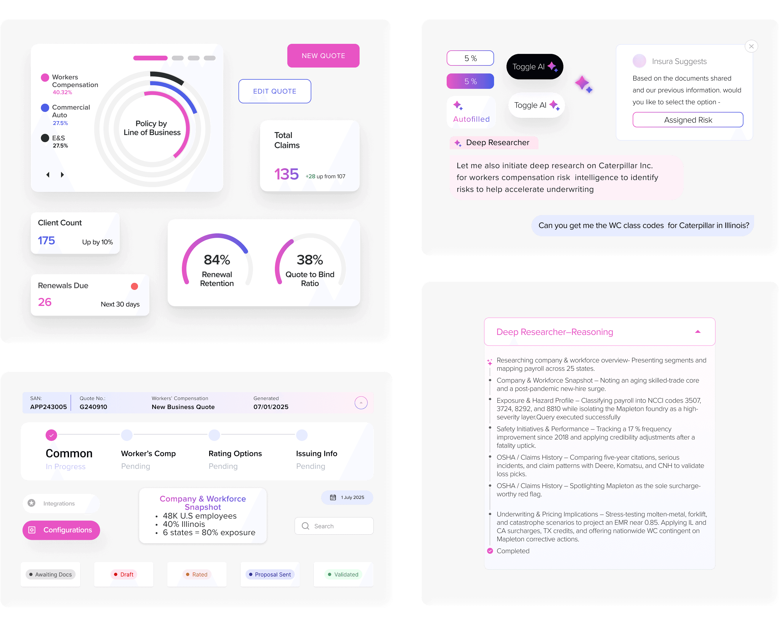 AI Toggle allows users to work entirely manually or use the AI chatbot to verify and auto-fill content, or switch between modes as needed. Contextual dashboard elements provide agents with performance metrics, quote completion patterns, and workload visibility without requiring navigation to separate reporting tools.