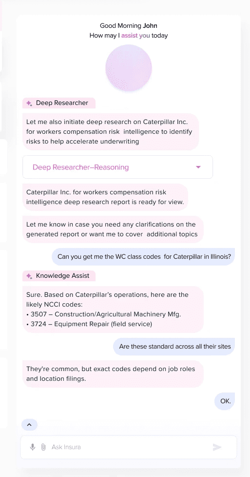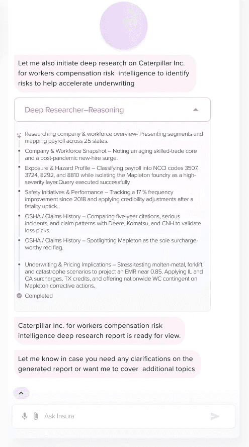With an in-house chat assistant, we aim to provide users with assistance on any questions regarding insured companies. Our built in AI tools such as Deep Researcher, Agentic Visualizer aim to assist users on any impromptu questions or doubts and provide accurate answers instantly.